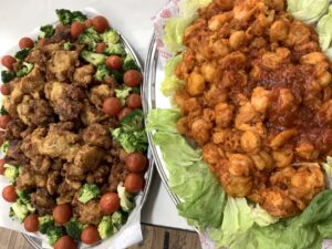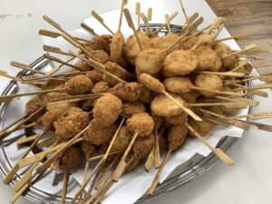 お昼ごはんに串カツやオムライス、唐揚げ、ポテトサラダを召し上がっていただき